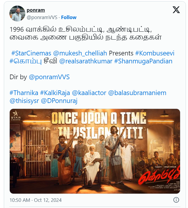 It’s now known that the film is titled Kombuseevi and the makers have released its first look via social media. Ponram and Sarathkumar took to X to share the first look. The tweet mentioned that the film will be based on true stories that happened around Usilampatti and Andipatti.